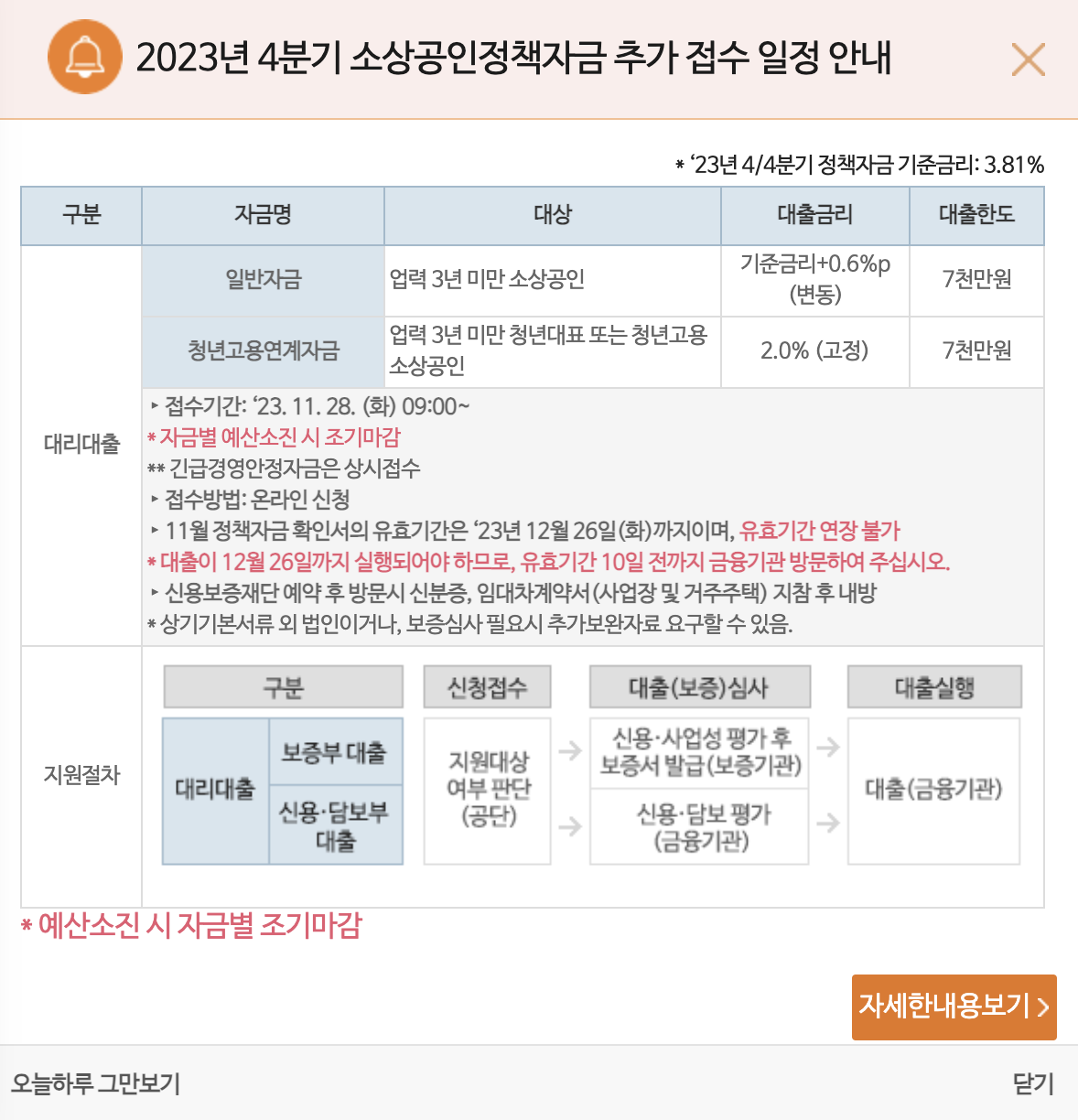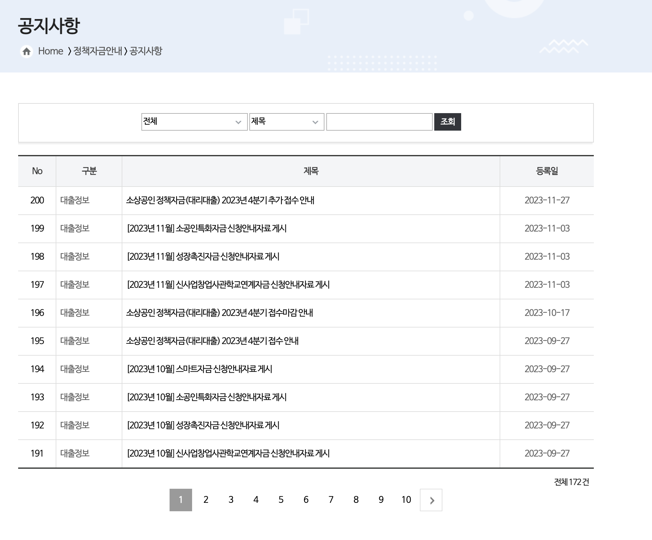가장 최신 글에 소상공인 정책자금 대리대출 2023년 4분기 추가접수안내에 대한 글이 올라와 있습니다. 아래 리스트도 참고하면 좋을 것 같습니다. 어느시기에 어떤 대출 지원제도 공고가 올라오는지 대략적으로 파악할 수 있으니까요.
