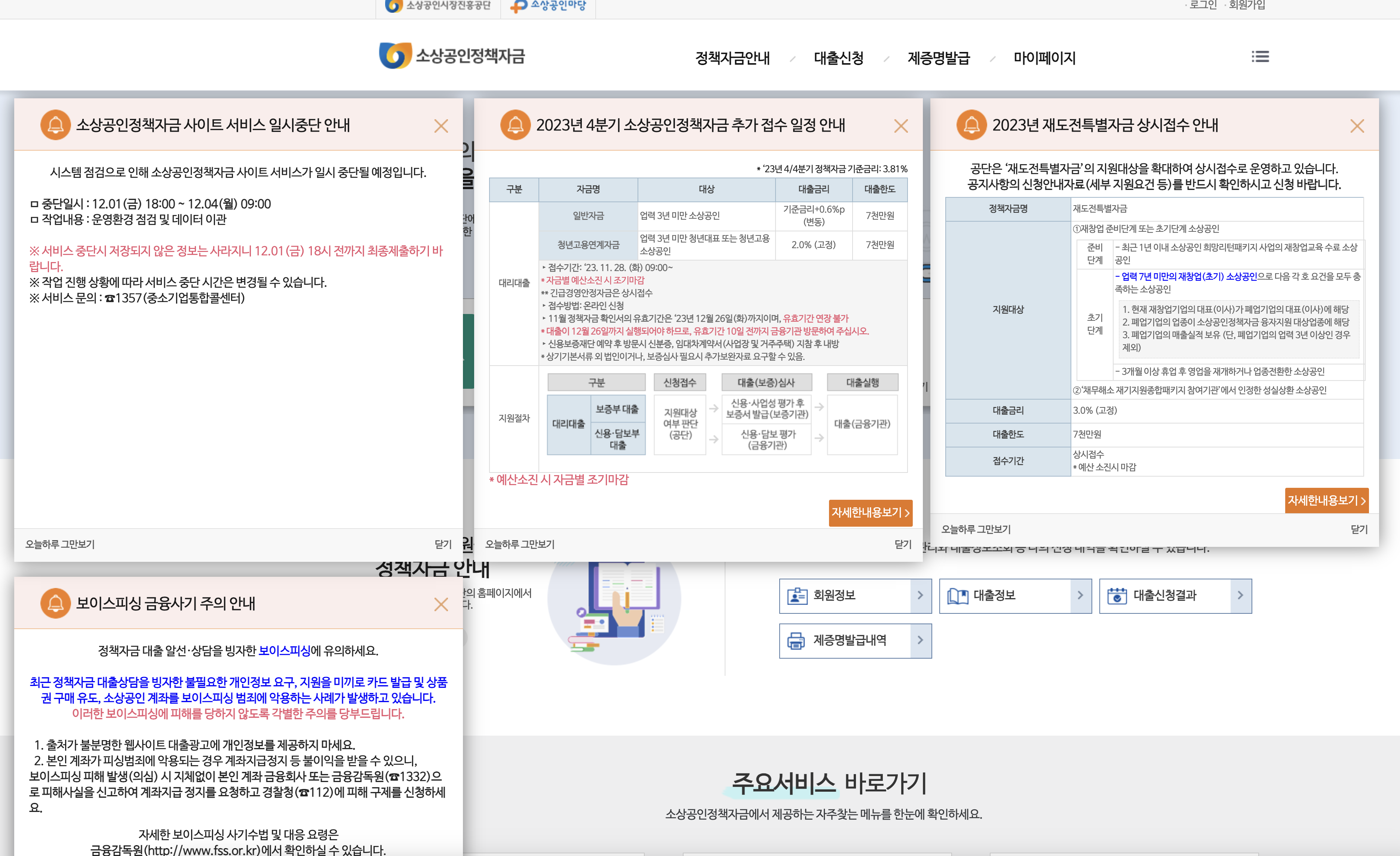 소상공인 정책자금 사이트로 들어가면 아래와 같은 화면이 나옵니다. 팝업창이 여러개 떠 있습니다. 팝업창에는 현재 진행중인 이벤트들이 나오는 경우가 많으니 주의깊게 살펴볼 필요가 있습니다.