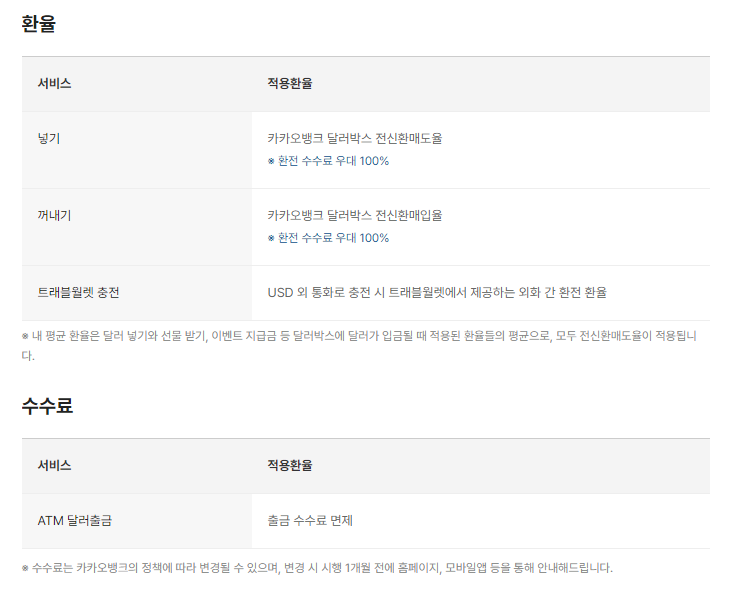 가장 눈에 띄는 장점은 환전수수료가 무료라는 것입니다. 해외여행 가기 전에 현지 통화로 환전해야 하는데 어디서 어떻게 환전해야 가장 유리한 수수료로 할 수 있는지 열심히 찾아본 적 다들 있으시죠? 이제 달러에 대해서는 그럴 필요가 없어졌습니다. 카카오뱅크 달러박스를 이용하면 되니까요 : )