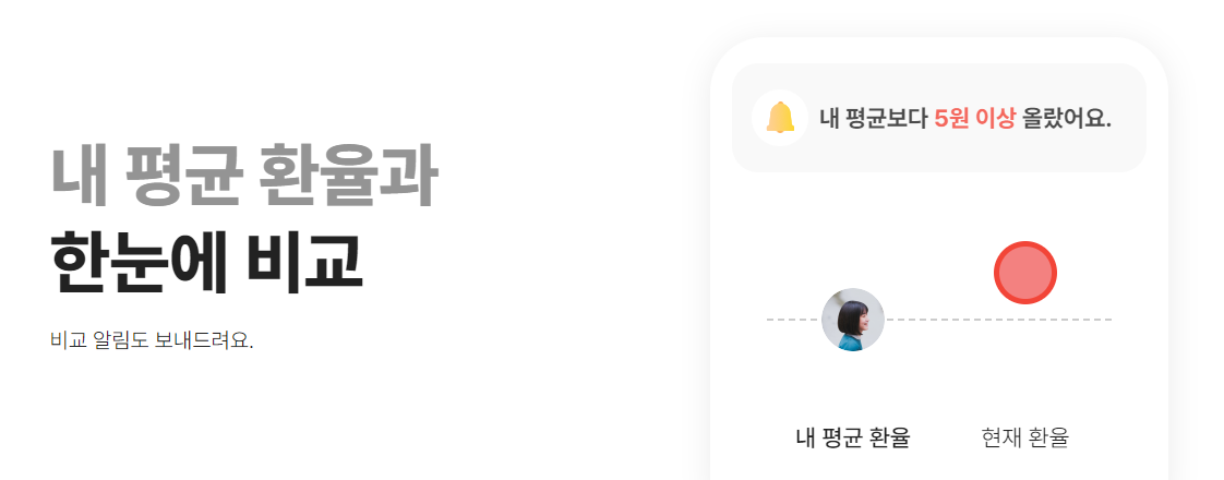 실제로 외화를 사용하는 용도가 아닌 환차익 투자를 하는 경우에도 아주 유용합니다. 수수료 부분의 혜택 뿐 아니라 환율 변화를 한눈에 비교할 수 있는 기능이 있습니다. 내 평균 환율과 현재의 환율을 수시로 비교확인 할 수 있어요. 원하는 경우 비교알림을 받을 수 있는 기능도 있으니 잘 활용하면 좋을 듯 합니다.