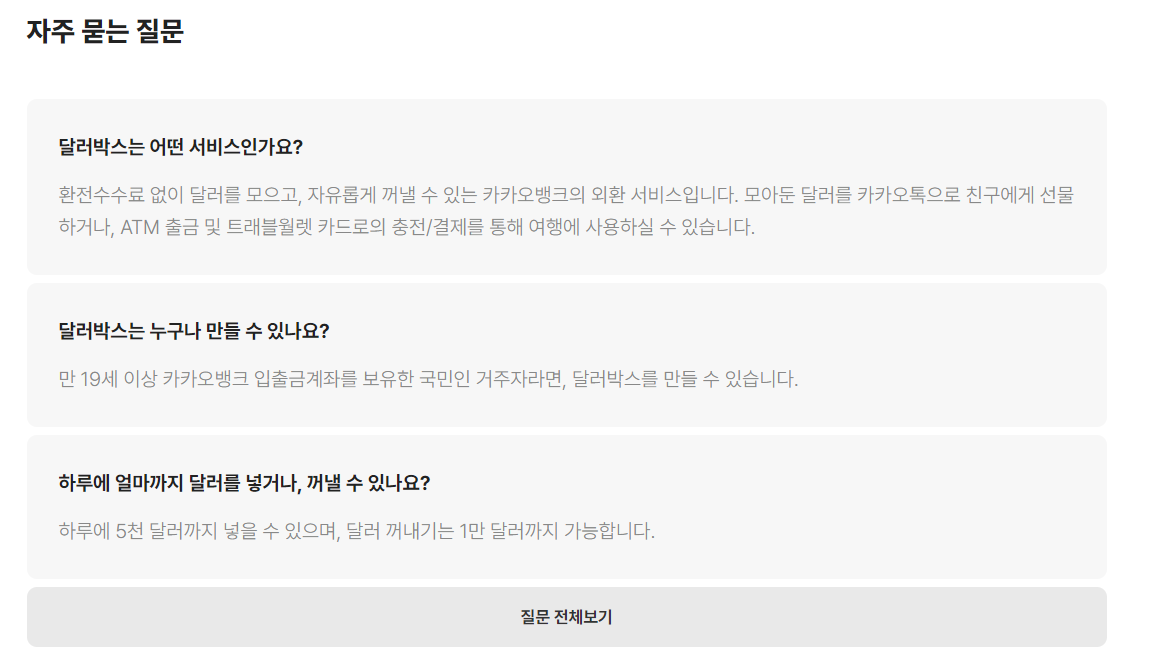 자주 묻는 질문에는 달러박스는 어떤 서비스인가? 달러박스는 누구나 만들수 있는가? 1일 달러 입출금 기준은 얼마인가 등입니다.