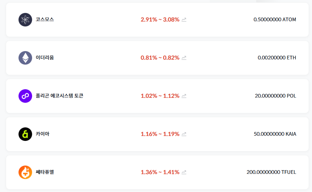 코인 거래를 하고 있다면 손해볼 것이 전혀 없는 서비스인 것 같습니다. 다른 사이트들처럼 스테이킹을 한다고 코인 거래에 제한이 생기지 않으므로 적은 보상률이라도 살뜰하게 챙기는 편이 좋지 않을까 생각합니다.