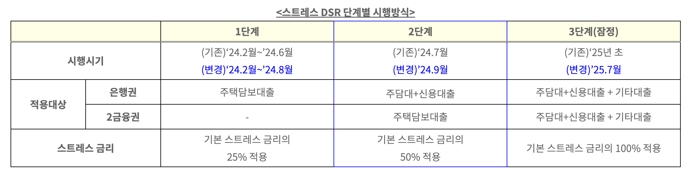 3단계는 제 1,2금융권의 거의 모든 대출이라고 봐야합니다. 주담대, 신용대출, 기타대출이 전부 포함됩니다. 스트레스 금리도 100% 적용되고요. 시행시기는 2025년 7월로 아직 확정은 아니고 잠정입니다.